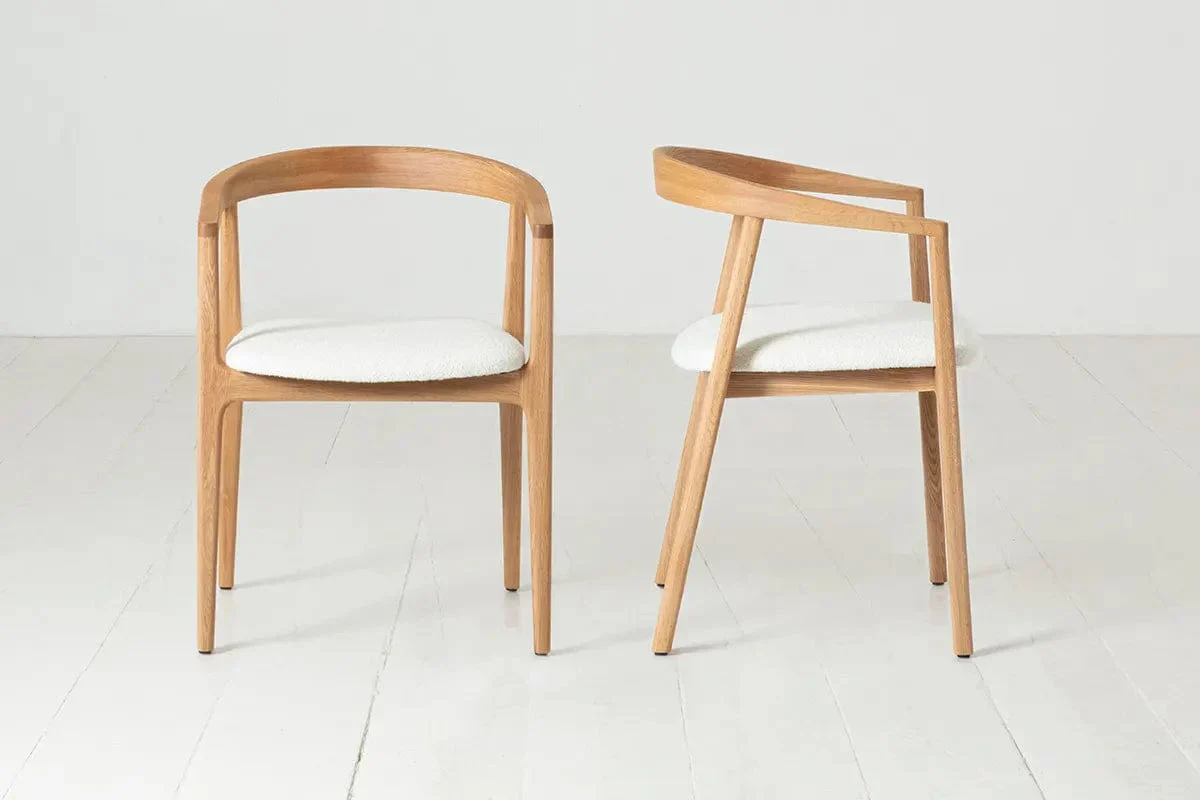 Der Esszimmerstuhl 01 verfügt über ein geschwungenes Gestell aus massivem Eichenholz. Er ist in Leder, Samt, Bouclé oder Leinen erhältlich und passt daher in jedes Zuhause.